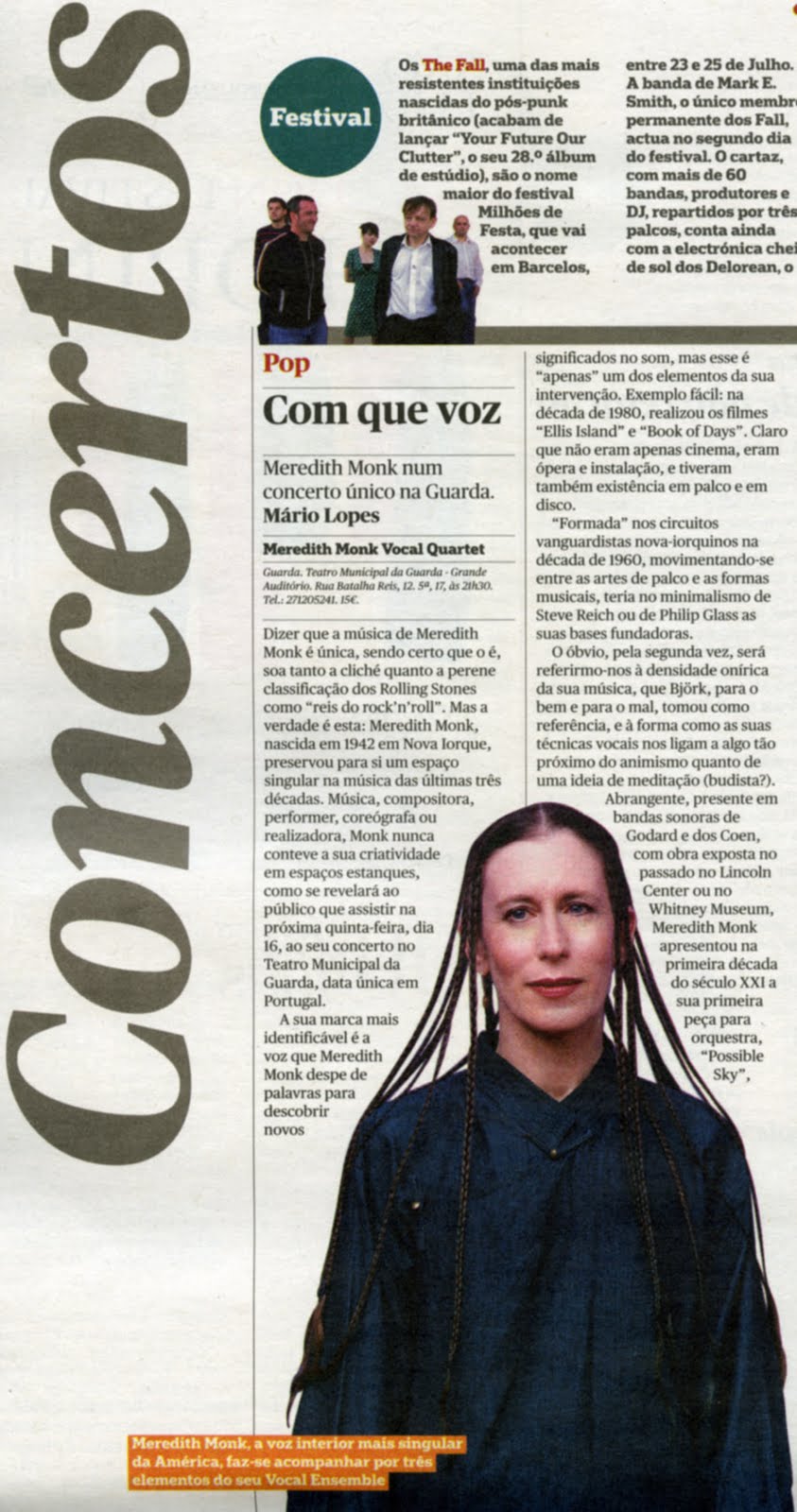 As prodigiosas criações vocais da norte-americana Meredith Monk têm palco exclusivo no TMG esta quinta-feira, dia 17 de Junho. A cantora sobe ao palco do Grande Auditório, às 21h30, acompanhada pelas vozes de Katie Geissinger e Allison Sniffin, esta última também ao piano, e ainda por Bohdan Hilash nos instrumentos de sopro. Meredith Monk é compositora, cantora, coreógrafa, autora de nova ópera, peças de teatro musical, filmes e instalações. Uma pioneira naquilo a que agora se designa por “técnica vocal estendida” e “performance interdisciplinar,” Monk cria trabalhos que misturam música e movimento, imagem e objecto, luz e som, num esforço por descobrir novos modos da percepção. A sua exploração da voz como um instrumento, como uma linguagem eloquente por si só, expande as fronteiras da composição musical, criando paisagens sonoras que desenterram sentimentos, energias, e memórias para as quais não temos palavras. Foi proclamada como “uma maga da voz” e “uma das compositoras mais cool da América.” Durante uma carreira que se estende ao longo de 40 anos, foi aclamada pelo público e pela crítica como uma enorme força criativa nas artes performativas.